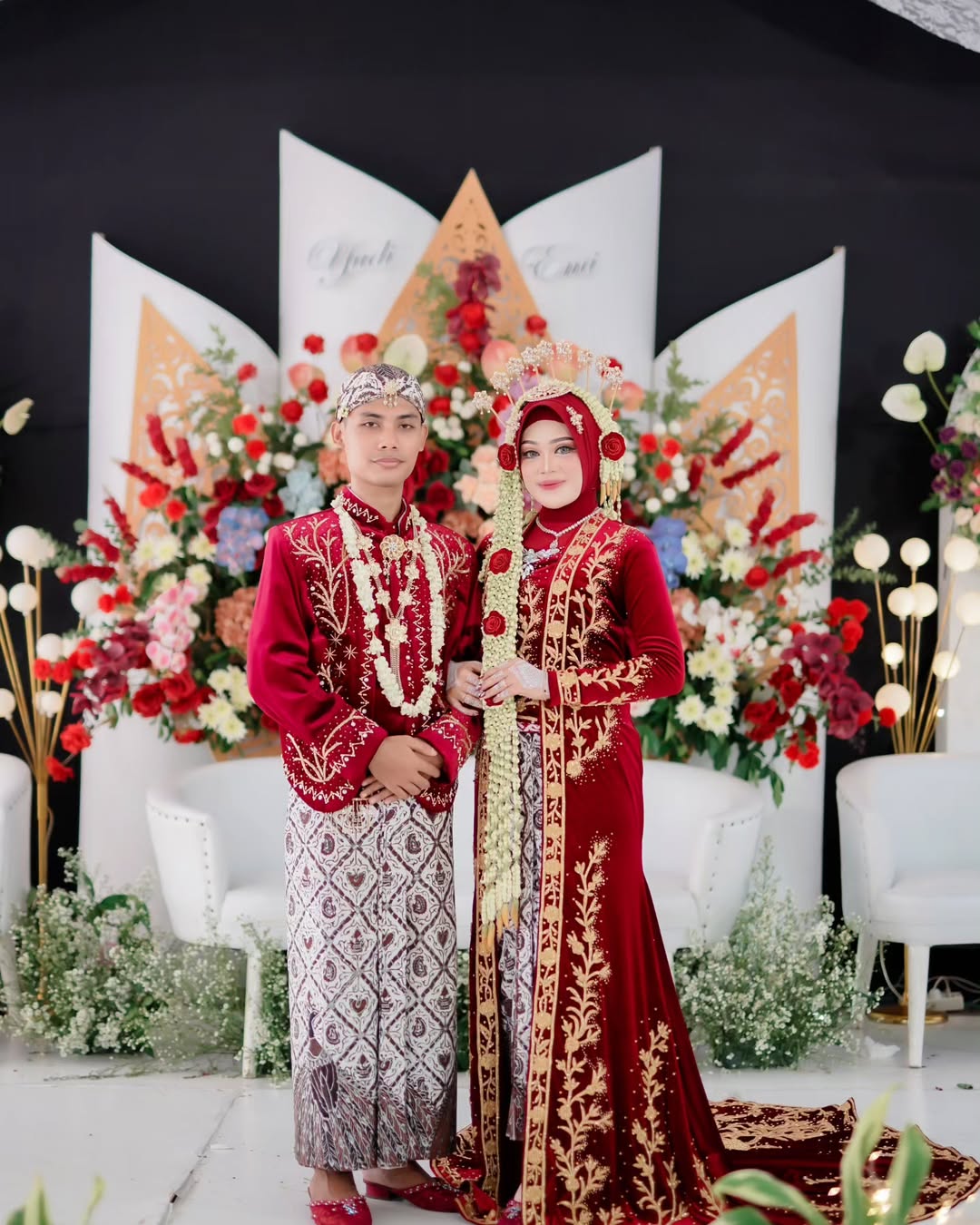 Foto pasangan pengantin dengan busana adat Jawa yang anggun, berpose di depan dekorasi bunga yang meriah. Momen sakral yang dipenuhi keindahan budaya dan kebahagiaan cinta