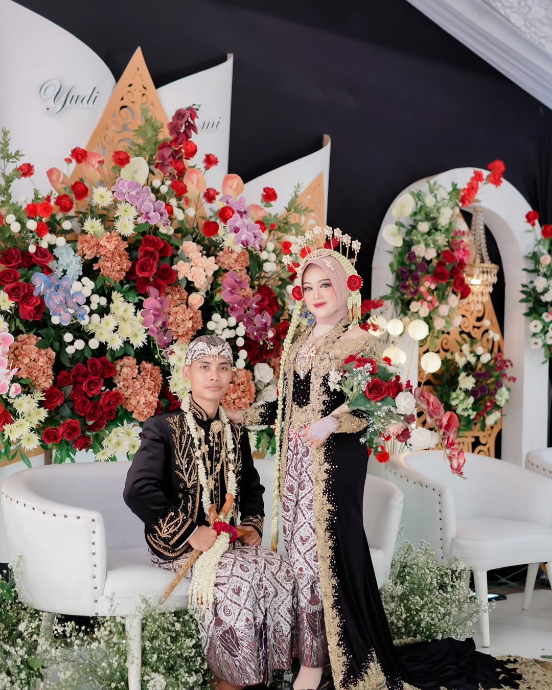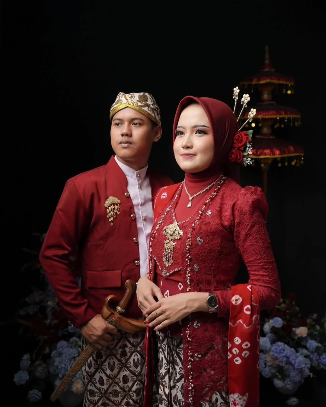 Tampilan pasangan dengan busana adat yang kaya akan detail budaya, mencerminkan keanggunan serta nilai-nilai luhur warisan leluhur dalam suasana yang elegan dan berkelas