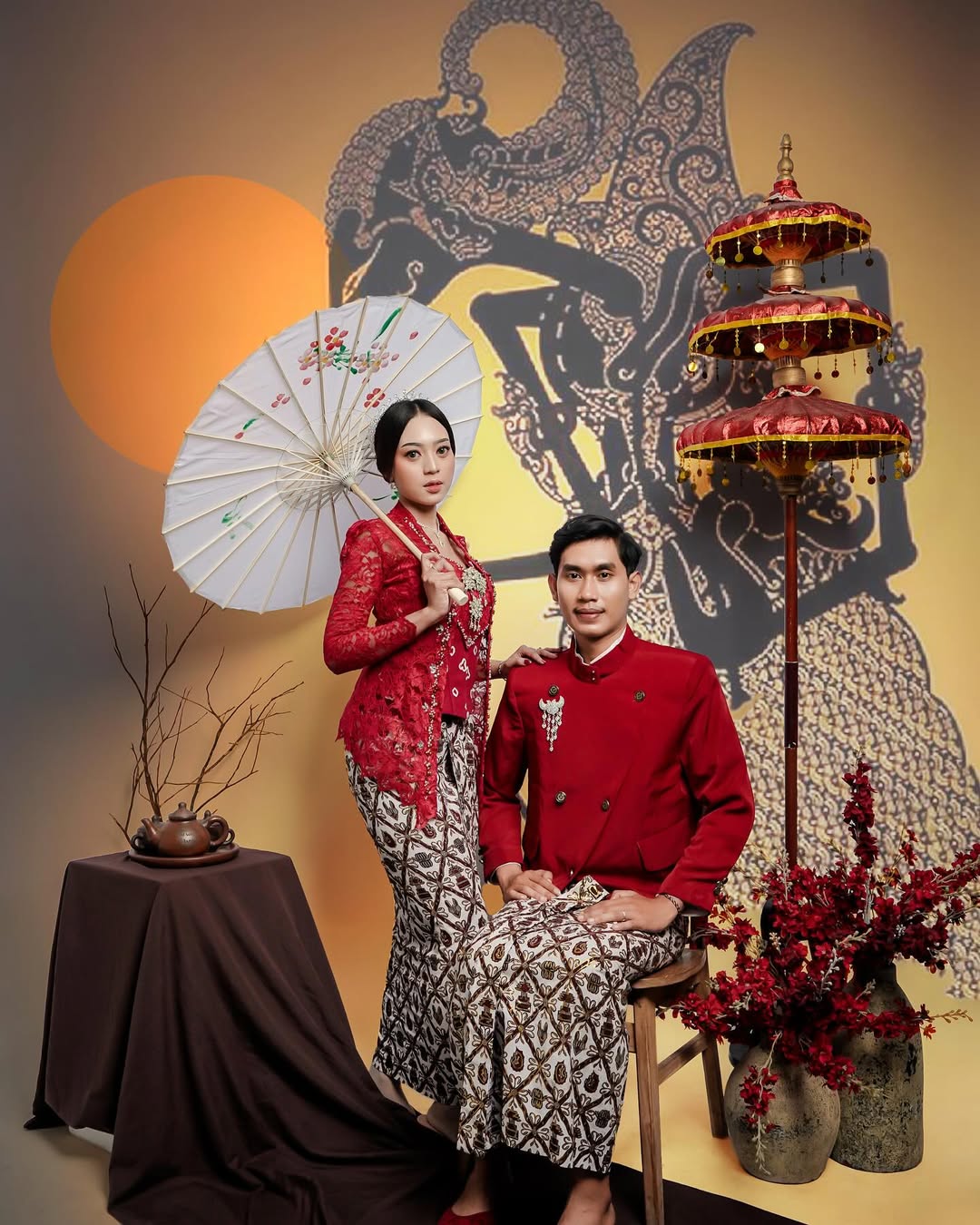 Sepasang pria dan wanita mengenakan busana adat tradisional berwarna merah yang elegan, mencerminkan kekayaan budaya dan keindahan tata rias khas daerah